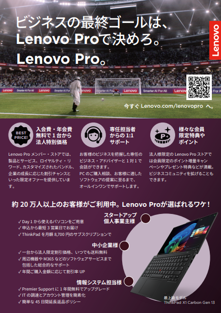 Lenovo Pro法人向けストアでは、特別価格やお得なポイント、専任担当が1対1でサポートする安心の国内体制など、ビジネスを後押しする特典を多数ご用意。
