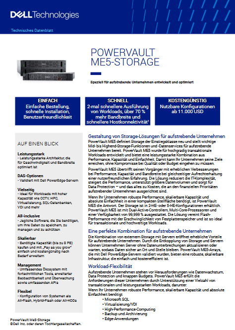 Dell PowerVault ME5 bietet leistungsstarken und kosteneffizienten Speicher, der speziell für virtualisierte Umgebungen wie VMware vSphere und Microsoft Hyper-V entwickelt wurde. Mit bis zu 800.000 IOPS, Dual-Active-Controllern und flexiblen Konnektivitätsoptionen (iSCSI, Fibre Channel, SAS) vereinfacht ME5 das Speicher-Management und bietet gleichzeitig Zuverlässigkeit auf Enterprise-Niveau zu einem erschwinglichen Preis. Die Lösung bietet nahtlose Integration, automatisches Tiering und integrierte Datenschutzfunktionen, die mit den Anforderungen Ihres Unternehmens wachsen – und dabei Ihr Budget schonen.
