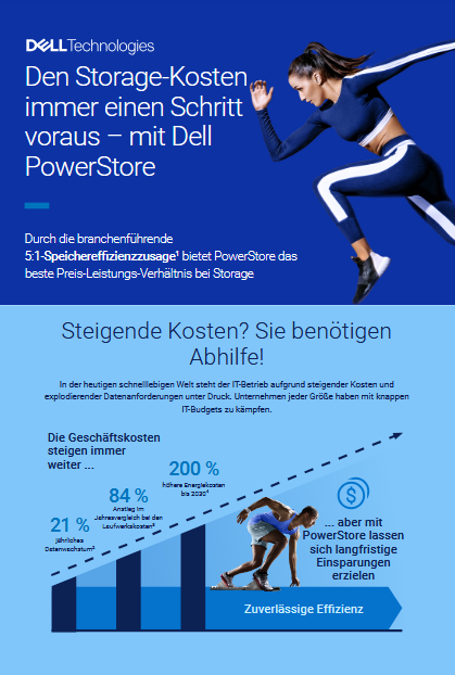 Dell PowerStore bietet Enterprise-Storage, das durch fortschrittliche Technologien zur Datenreduktion echten geschäftlichen Mehrwert schafft. Mit einer branchenführenden 5:1-Garantie zur Datenreduktion senkt PowerStore die Betriebskosten um 24 %, ermöglicht eine Amortisierung der Investition in nur 11 Monaten und erzielt einen ROI von 468 % über drei Jahre. Die Lösung verbraucht bis zu 54 % weniger Energie als Wettbewerbsprodukte und hilft Ihnen dabei, Budget- und Nachhaltigkeitsziele gleichzeitig zu erreichen. Die intelligente Architektur von PowerStore skaliert effizient, reduziert den Platzbedarf im Rack und liefert vorhersehbare Leistung, ohne Ihre Workloads zu beeinträchtigen. Laden Sie das Dokument herunter, um mehr zu erfahren. Laden Sie das Dokument herunter, um mehr zu erfahren.